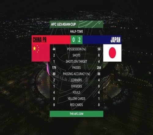 半场U23国足0-2落后日本U23,半场U23国足控球率44%,U23日本控球率56%。